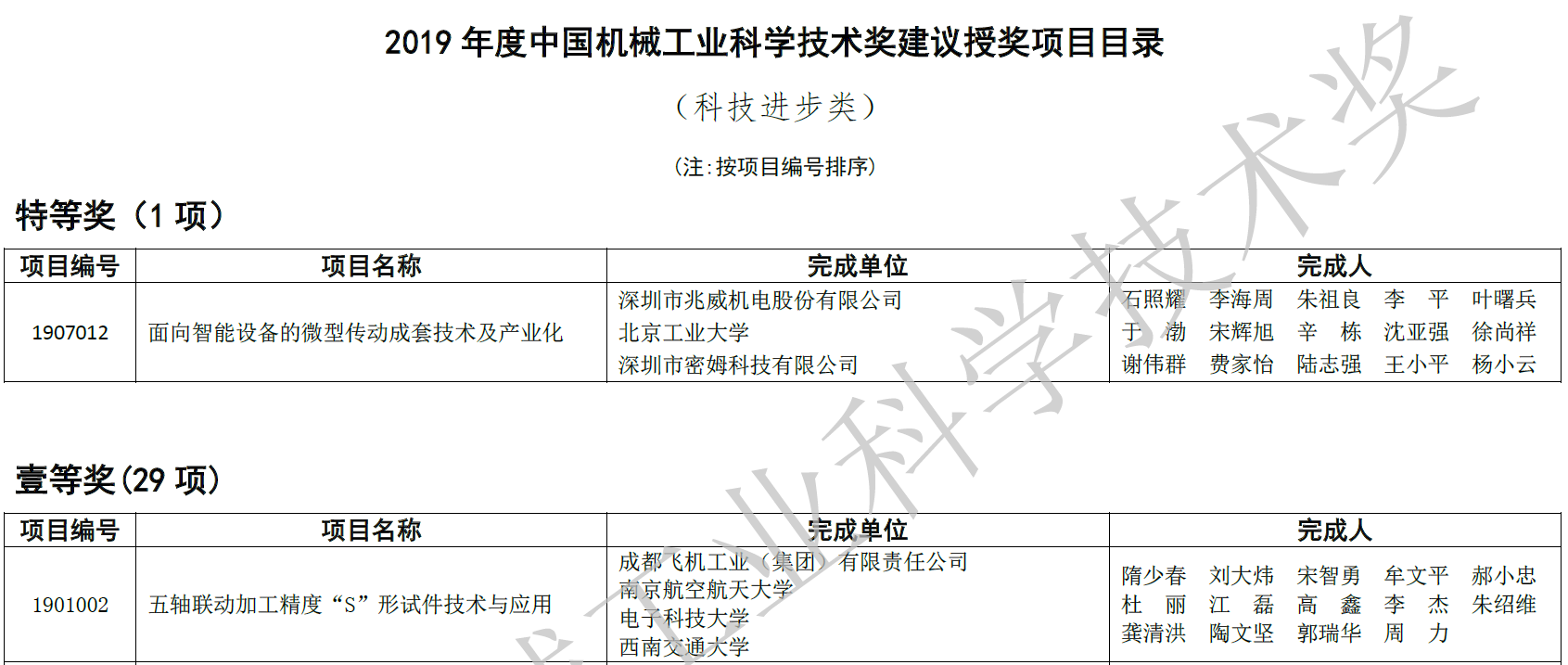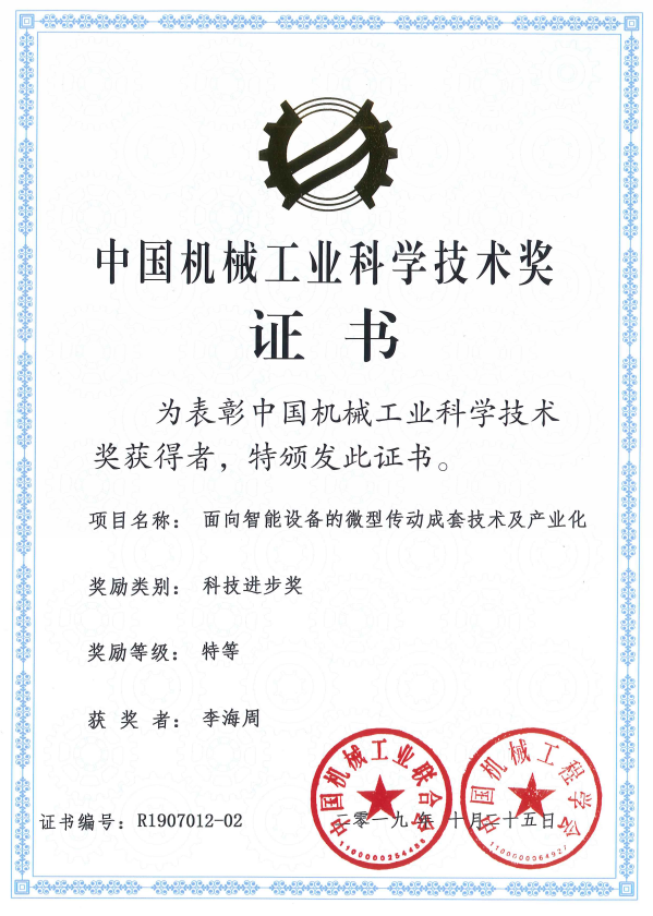 2019年10月11日,中國機(jī)械工程學(xué)會官網(wǎng)發(fā)布了《關(guān)于表彰2019年度中國機(jī)械工業(yè)科學(xué)技術(shù)獎獎勵項目的通報》,其中我司與北京工業(yè)大學(xué)、深圳市密姆科技有限公司聯(lián)合開展的項目---面向智能設(shè)備的微型傳動成套技術(shù)及產(chǎn)業(yè)化,榮獲科技進(jìn)步獎特等獎(證書編號 R1907012-02 頒獎信息:2019年度中國機(jī)械工業(yè)科學(xué)技術(shù)獎頒獎大會 http://www.cmiao.com.cn/cms/news/773.htm)。